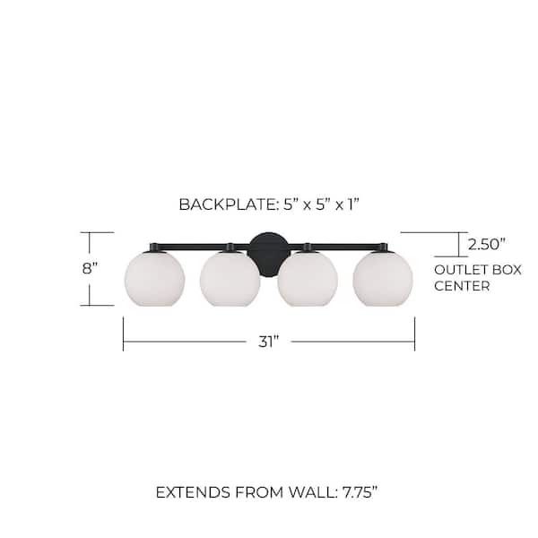 31 in. W x 8 in. H 4-Light Circular Globe Vanity Light in Matte Black with Soft White Glass