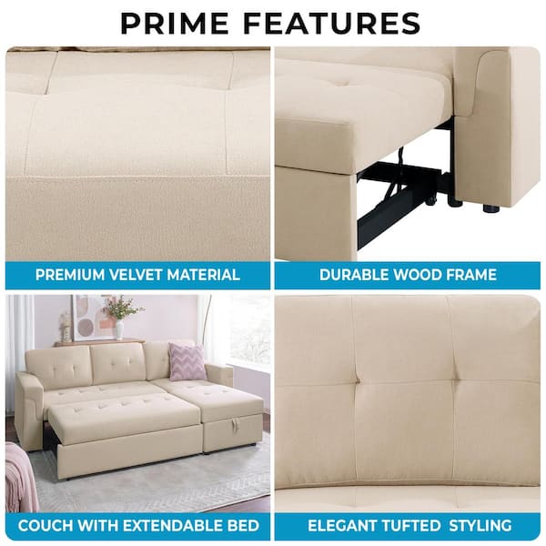 84.64 in. Velvet L-Shaped Sleeper Sectional Sofa with Square Arms in. Beige, Reversible Chaise, and Pull-out Sofa Bed