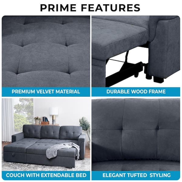 84.64 in. Velvet L-Shaped Sleeper Sectional Sofa with Square Arms in Dark Gray, Reversible Chaise, and Pull-out Sofa Bed