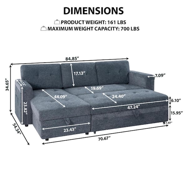 84.85 in. Reversible Microfiber Sleeper Sectional Sofa in Gray with Storage and USB Ports