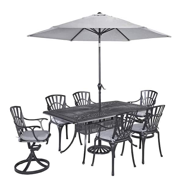 Grenada Charcoal Gray 7-Piece Cast Aluminum Rectangular Outdoor Dining Set with Umbrella with Gray Cushions