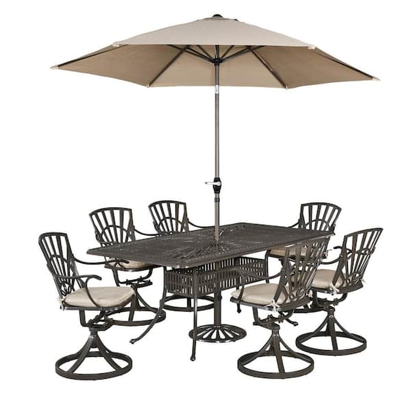 Grenada Taupe Tan 7-Piece Cast Aluminum Rectangular Outdoor Dining Set with Umbrella with Natural Tan Cushions