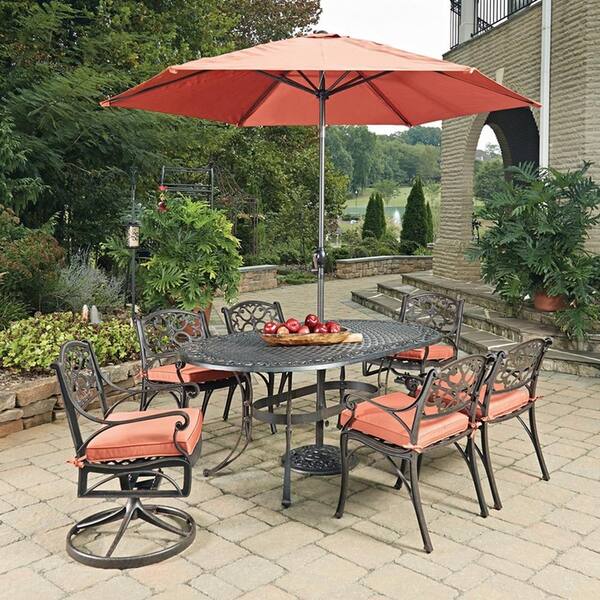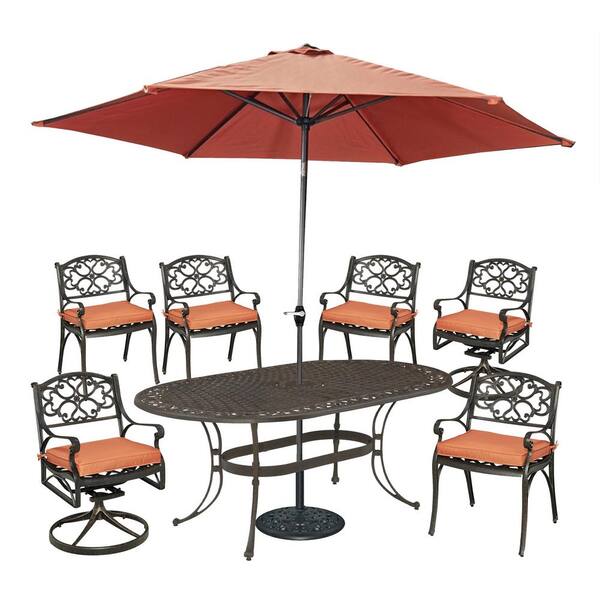 Sanibel Rust Bronze 9-Piece Cast Aluminium Oval Outdoor Dining Set with Orange Coral Cushions Umbrella