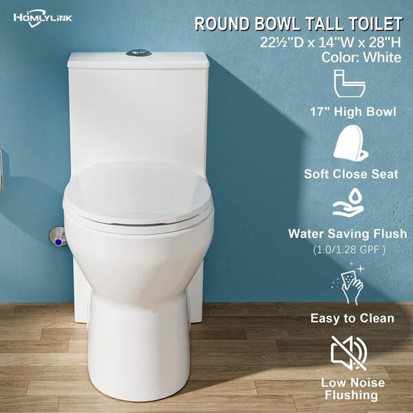 1-Piece Toilet 17 in. Tall Toilet 1.0/1.28 GPF Dual Flush Elongated Toilet in White with Soft Close Seat ADA Toilet