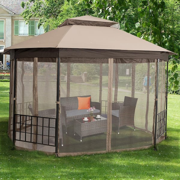 12 ft. x 10 ft. Brown Octagonal Canopy Tent Patio Gazebo Canopy Shelter with Mosquito Netting