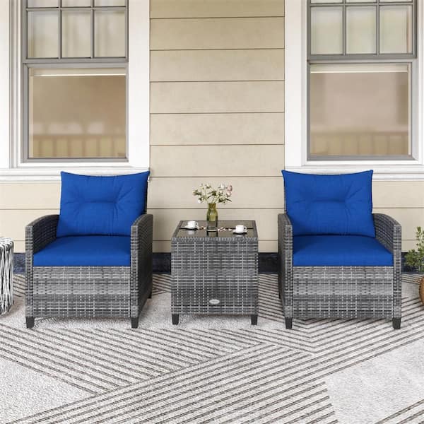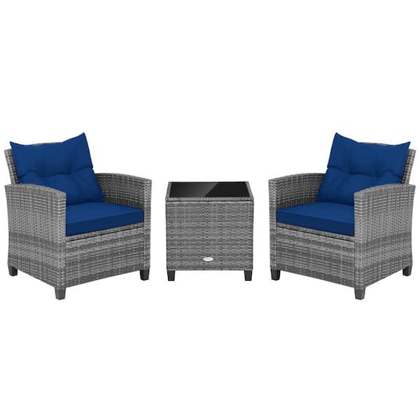 3-Piece Wicker Patio Rattan Conversation Set with Navy Cushions