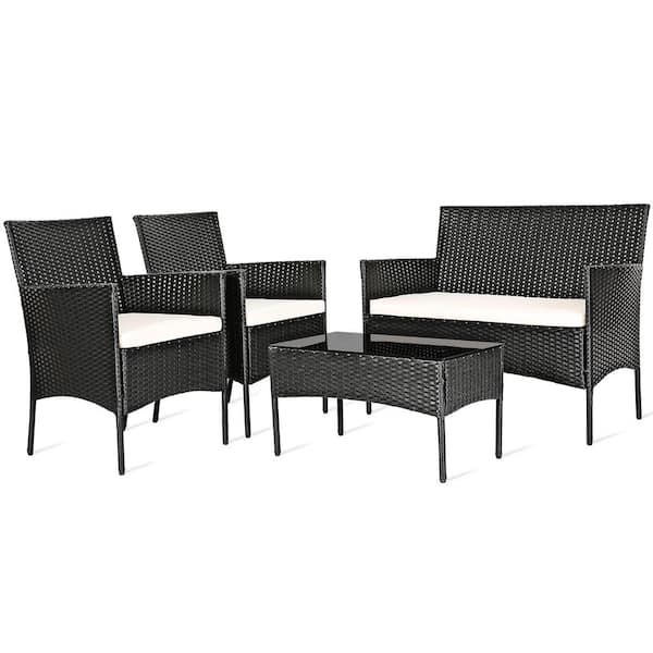 4-Piece Wicker Outdoor Loveseat Furniture Set Chairs Sofa with Beige Cushions