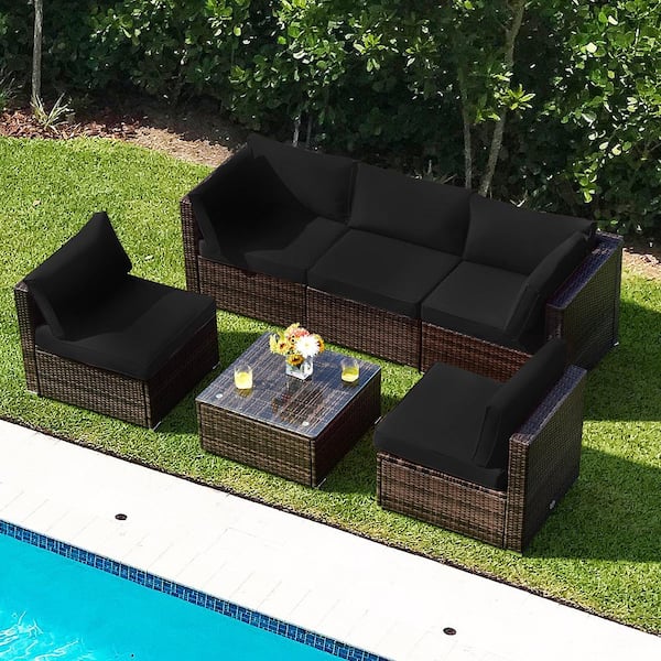6-Piece Wicker Outdoor Sectional Conversation Furniture Set with Coffee Table & Black Cushions