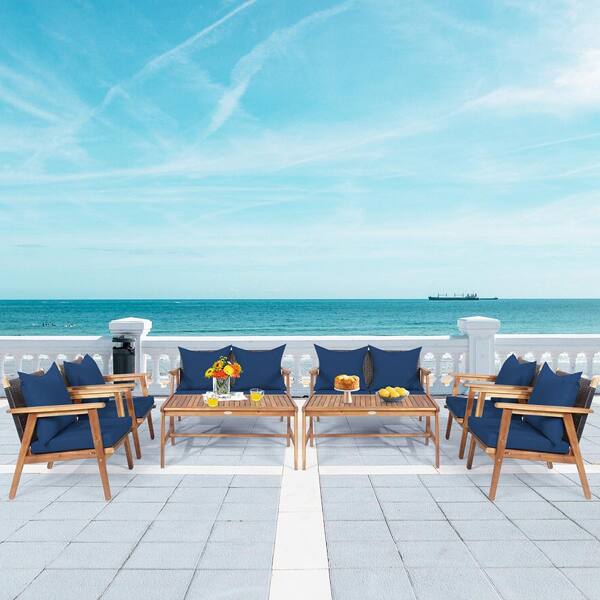 8PCS Wood Patio Conversation Set Sectional Sofa Set for Garden with Coffee Table and Navy Cushions