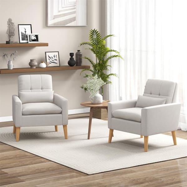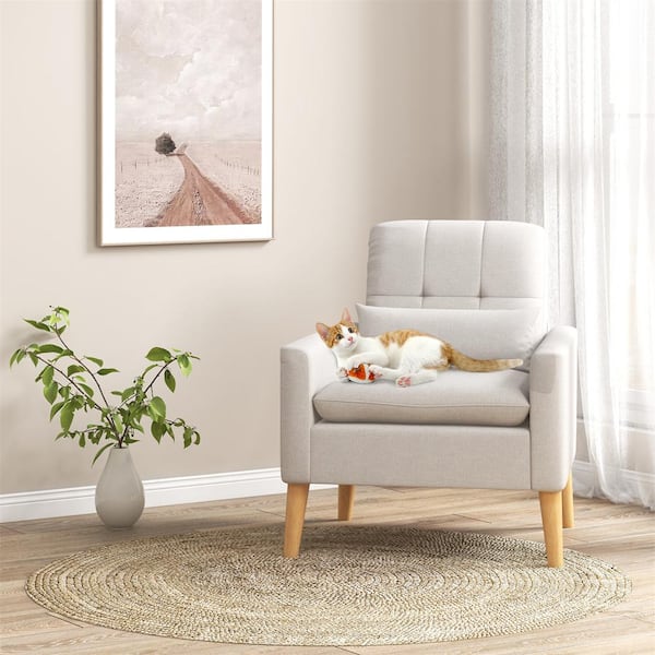 Beige Upholstered Tufted Accent Armchair with Lumbar Pillow Natural Rubber Wood Legs