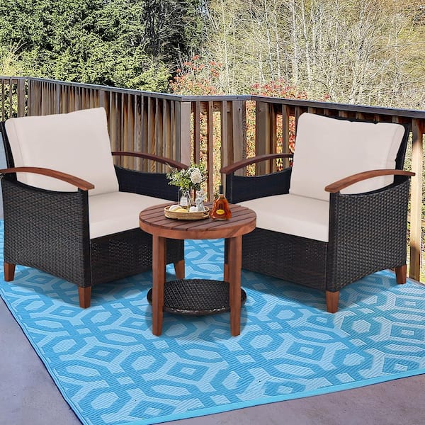 Brown 3-Piece Wicker Patio Conversation Set Outdoor Rattan Bistro Set with Beige Cushions