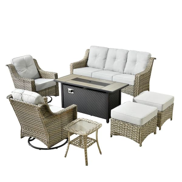 Cherry 7-Piece Wicker Outdoor Furniture Patio Fire Pit Conversation Sofa Set with Swivel Chairs and Light Grey Cushions