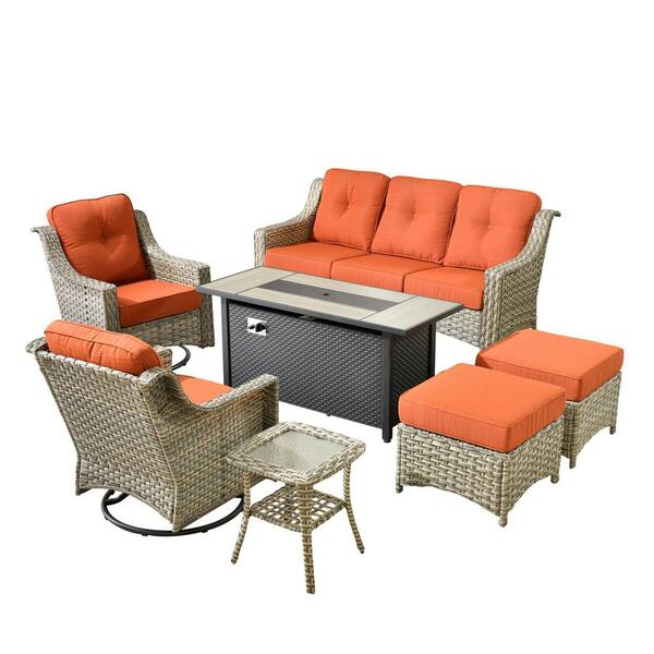 Cherry 7-Piece Wicker Outdoor Furniture Patio Fire Pit Conversation Sofa Set with Swivel Chairs and Orange Red Cushions