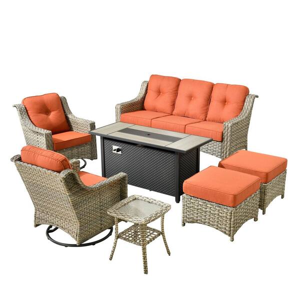 Cherry 7-Piece Wicker Outdoor Furniture Patio Fire Pit Conversation Sofa Set with Swivel Chairs and Red Cushions