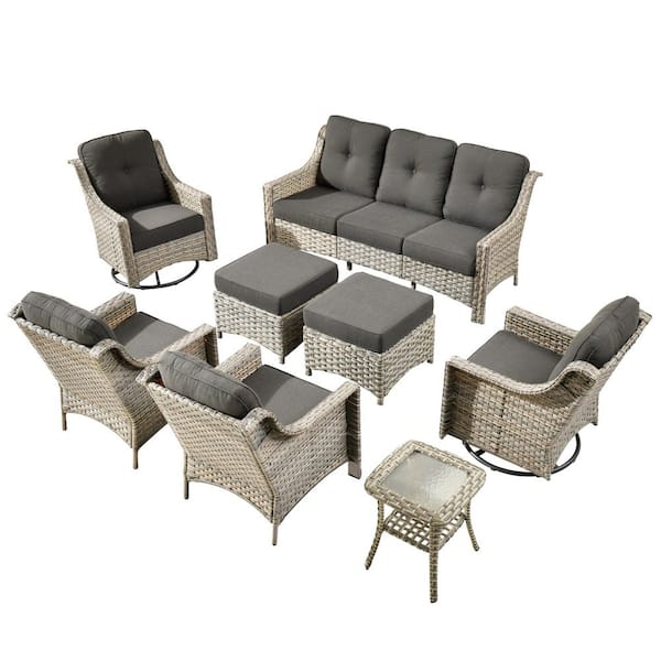 Cherry 8-Piece Wicker Outdoor Furniture Patio Conversation Sofa Seating Set with Swivel Chairs and Black Cushions