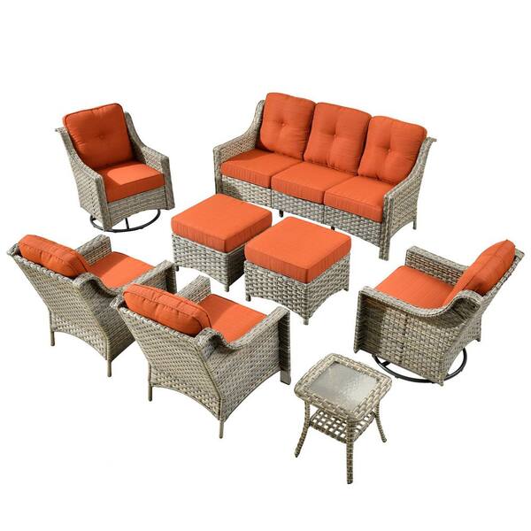Cherry 8-Piece Wicker Outdoor Furniture Patio Conversation Sofa Seating Set with Swivel Chairs and Orange Red Cushions