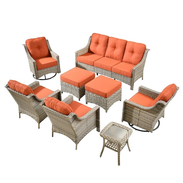Cherry 8-Piece Wicker Outdoor Furniture Patio Conversation Sofa Seating Set with Swivel Chairs and Red Cushions