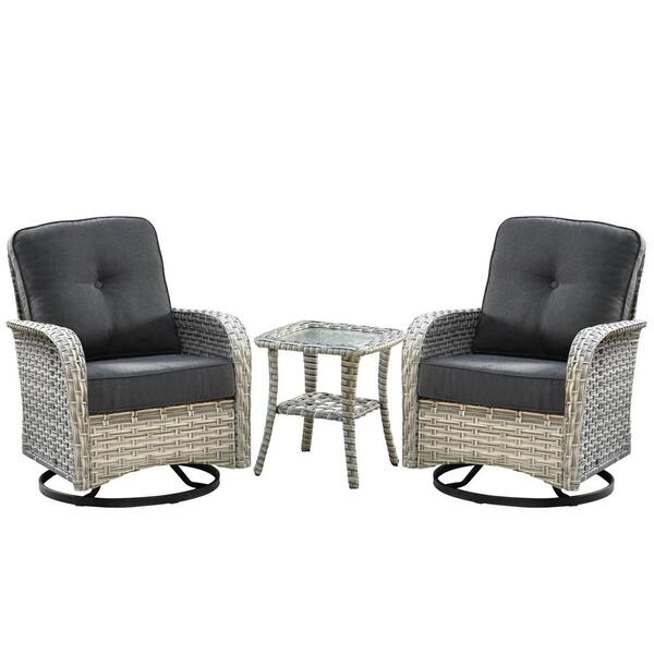 Clara 3-Piece Wicker Outdoor Patio Conversation Swivel Chair Set with a Side Table and Black Cushions