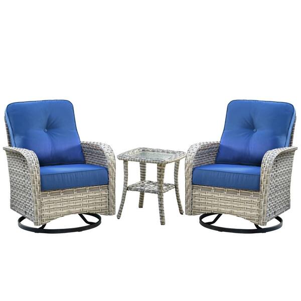 Clara 3-Piece Wicker Outdoor Patio Conversation Swivel Chair Set with a Side Table and Navy Blue Cushions