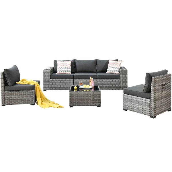 Crater Gray 6-Piece Wicker Wide-Plus Arm Outdoor Patio Conversation Sofa Set with Black Cushions