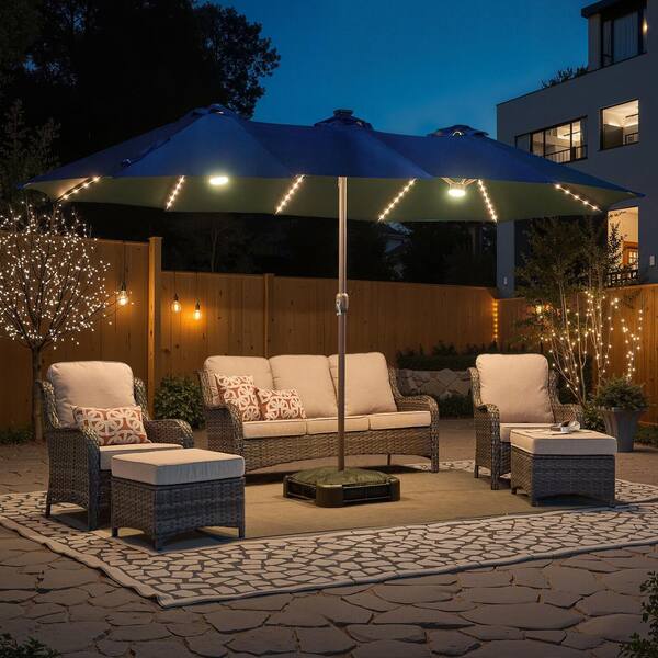 Extra-Large 8.5 x 14.5 ft. Rectangular Patio Umbrella with Solar Light, Steel Frame, Stand and Sand Bags in Dark Blue