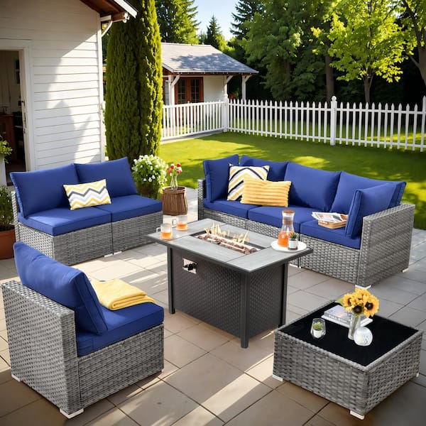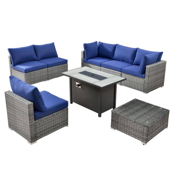 Helene Gray 8-Piece Wicker Outdoor Patio Conversation Sectional Sofa Set with a Metal Fire Pit and Navy Blue Cushions