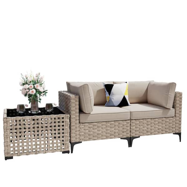 Holston 3-Piece Wicker Modern Outdoor Patio Conversation Chair Loveseat Set with a Solar-LED Table and Beige Cushions