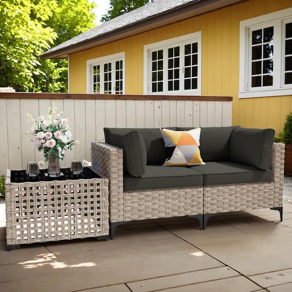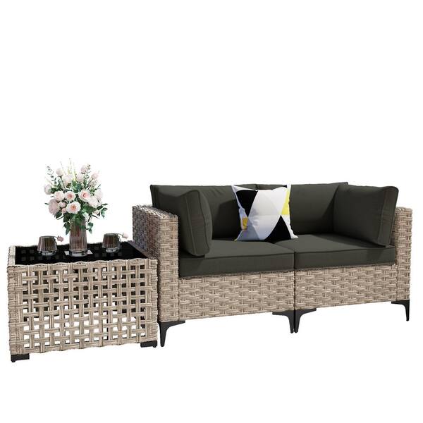 Holston 3-Piece Wicker Modern Outdoor Patio Conversation Chair Loveseat Set with a Solar-LED Table and Black Cushions