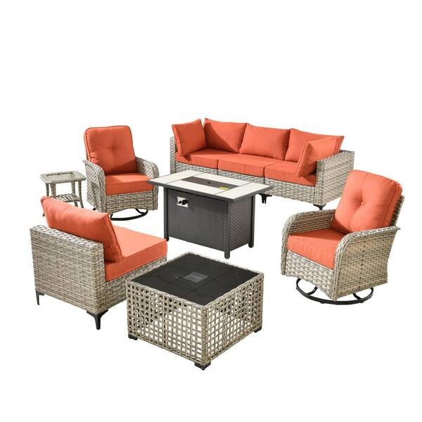 Holston 9-Piece Wicker Modern Outdoor Patio Metal Fire Pit Conversation Sofa Set with Swivel Chairs and Red Cushions