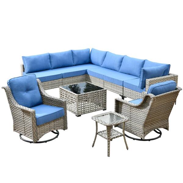 Howell 10-Piece Wicker Outdoor Patio Conversation Sofa Furniture Set with Swivel Rocking Chairs and Sky Blue Cushions