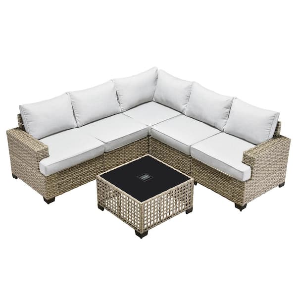 Kelleys 6-Piece Wicker Modern Outdoor Patio Conversation Sofa Sectional Set with Light Grey Cushions
