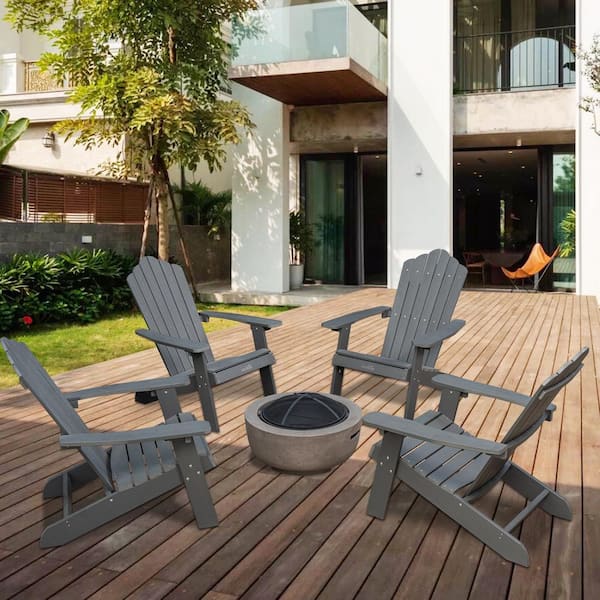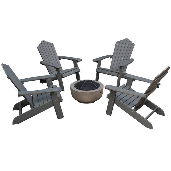 Lanier 5-Piece Charcoal Grey Recycled Plastic Patio Conversation Adirondack Chair Set with a Brown Wood-Burning Firepit