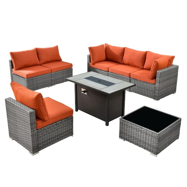 Messi Gray 8-Piece Wicker Outdoor Patio Conversation Sectional Sofa Set with a Metal Fire Pit and Orange Red Cushions