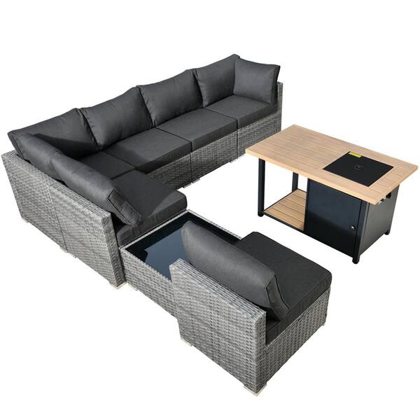 Messi Gray 8-Piece Wicker Outdoor Patio Conversation Sectional Sofa Set with a Storage Fire Pit and Black Cushions