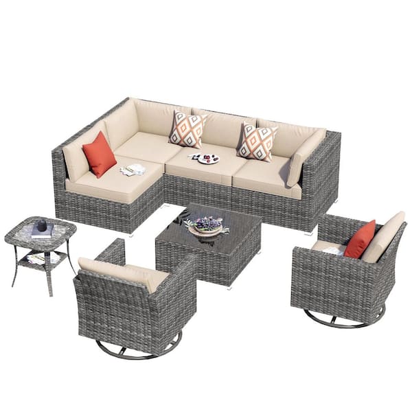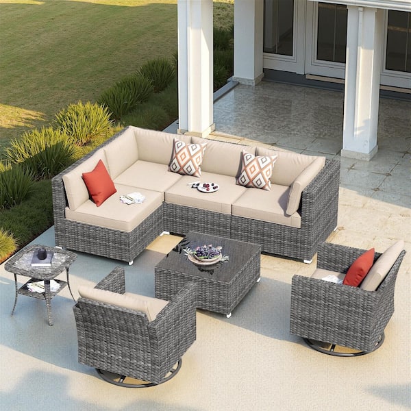 Messi Grey 8-Piece Wicker Outdoor Patio Conversation Sofa Seating Set with Swivel Rocking Chairs and Beige Cushions