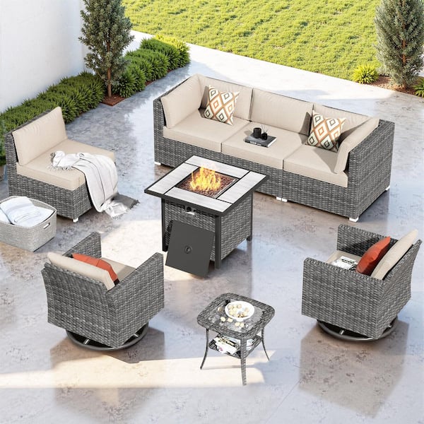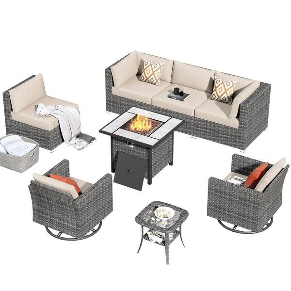 Messi Grey 8-Piece Wicker Outdoor Patio Fire Pit Conversation Sofa Set with Swivel Rocking Chairs and Beige Cushions