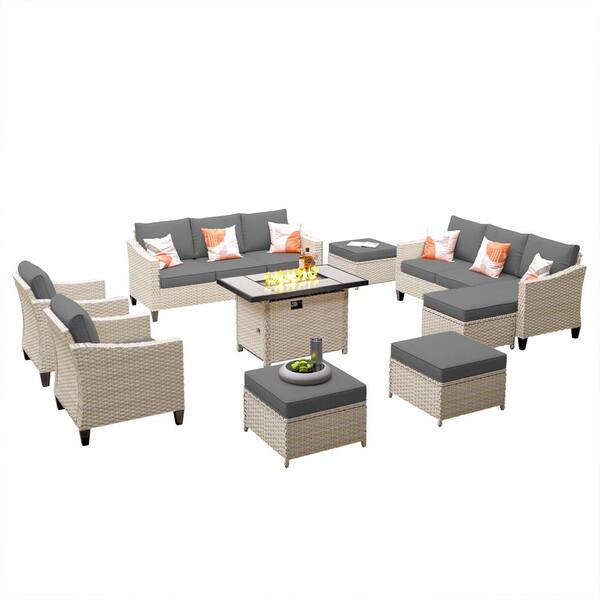 Oconee Beige 9-Piece Modern Outdoor Patio Conversation Sofa Set with a Rectangle Fire Pit and Dark Grey Cushions