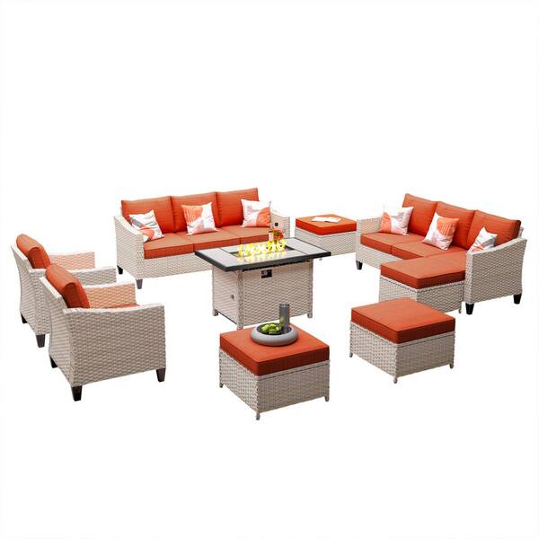 Oconee Beige 9-Piece Modern Outdoor Patio Conversation Sofa Set with a Rectangle Fire Pit and Orange Red Cushions