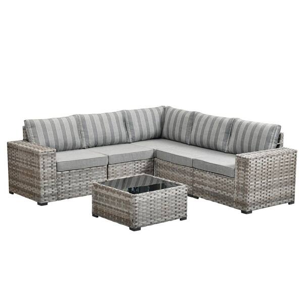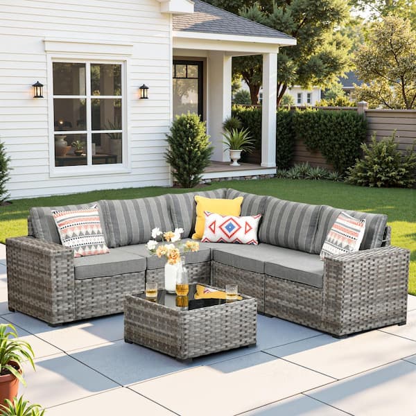 Rouge 6-Piece Wicker Outdoor Sectional Furniture Patio Conversation Sofa Set with a Table and Striped Grey Cushions