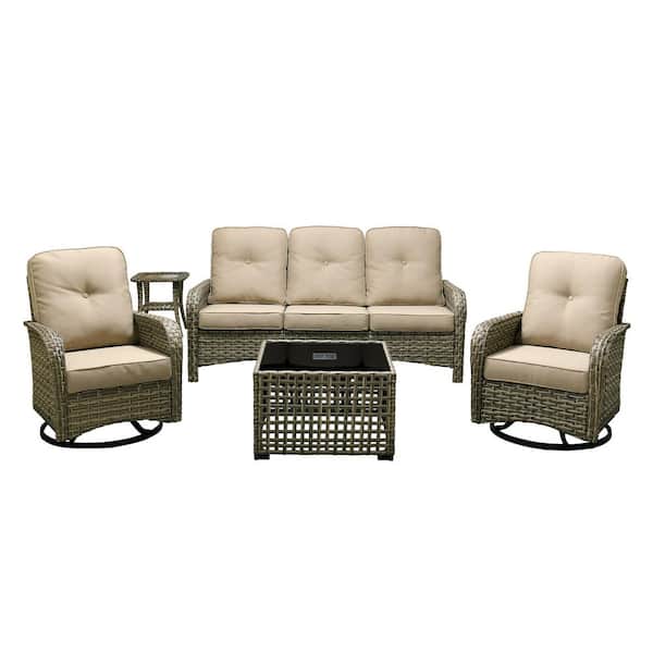 Ruby 5-Piece Wicker Outdoor Patio Conversation Sofa Set with Swivel Chairs, Solar-Light Coffee Table and Beige Cushions