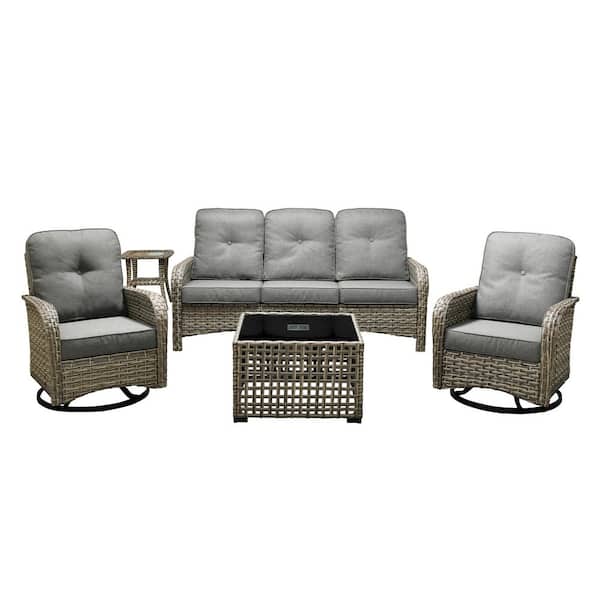 Ruby 5-Piece Wicker Outdoor Patio Conversation Sofa Set with Swivel Chairs, Solar-Light Table and Dark Grey Cushions