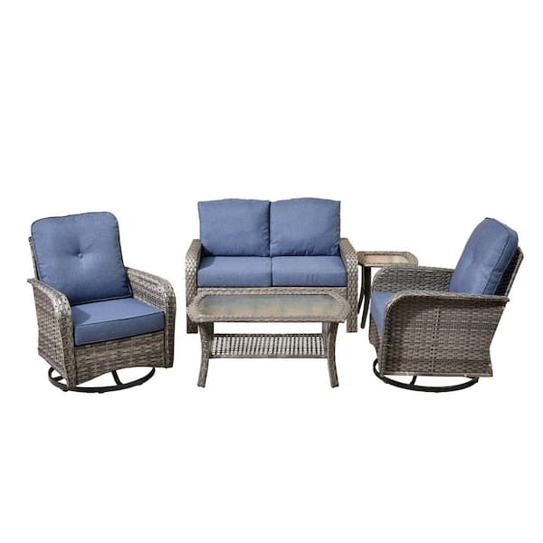 Ruby Grey 5-Piece Wicker Outdoor Furniture Patio Conversation Sofa Set with Swivel Chairs and Denim Blue Cushions