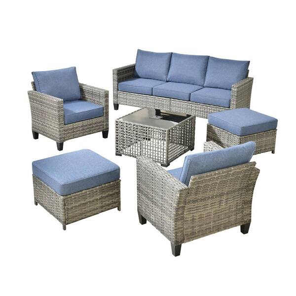 Scarlet 6-Piece Wicker Outdoor Furniture Patio Conversation Sofa Set with a Solar Lighted Table and Denim Blue Cushions