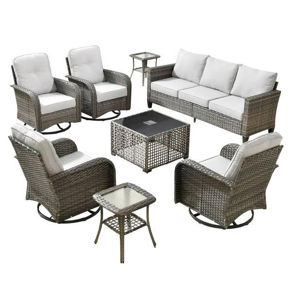 Scarlet 8-Piece Wicker Outdoor Patio Conversation Sofa Set with Swivel Chairs, a LED Table and Light Grey Cushions
