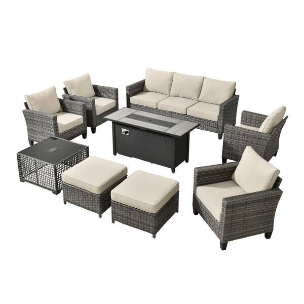 Scarlet 9-Piece Wicker Outdoor Fire Pit Patio Conversation Sofa Set with a Solar Lighted Table and Beige Cushions