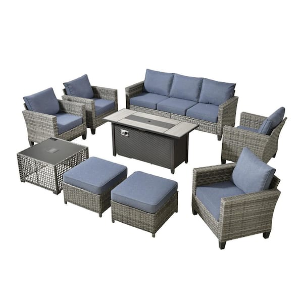 Scarlet 9-Piece Wicker Outdoor Fire Pit Patio Conversation Sofa Set with a Solar Lighted Table and Denim Blue Cushions