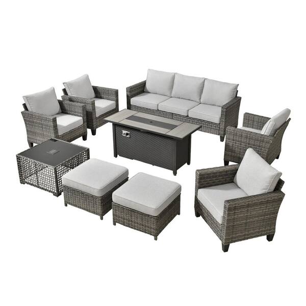 Scarlet 9-Piece Wicker Outdoor Fire Pit Patio Conversation Sofa Set with a Solar Lighted Table and Light Grey Cushions