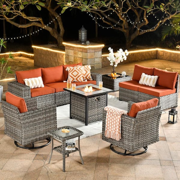 Tahoe Grey 10-Piece Wicker Swivel Rocking Outdoor Patio Conversation Sofa Set with a Fire Pit and Orange Red Cushions