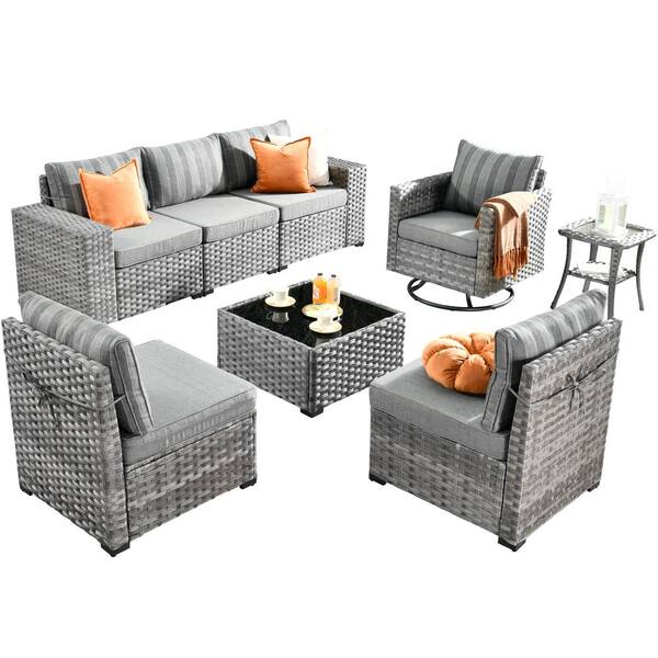 Tahoe Grey 8-Piece Wicker Outdoor Patio Conversation Sofa Set with a Swivel Rocking Chair and Striped Grey Cushions