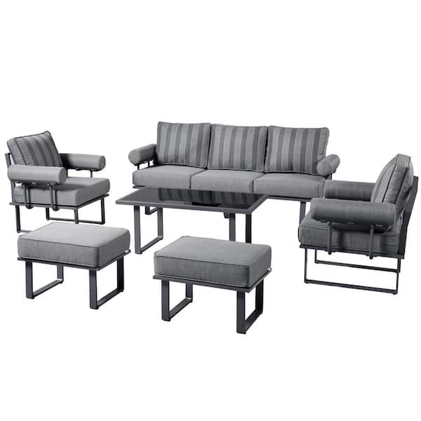 Teton Grand Gray 6-Piece Aluminum Outdoor Patio Conversation Sofa Set with Stripe Gray Cushions
